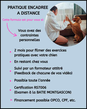 Que vous soyez en reconversion professionnelle, ou déjà actif dans le domaine canin, cette formation vous permet d'obtenir la certification RS7006 à travers deux modalités adaptées. À vous de choisir le format qui s’intègre le mieux à votre projet de vie ou votre activité actuelle :