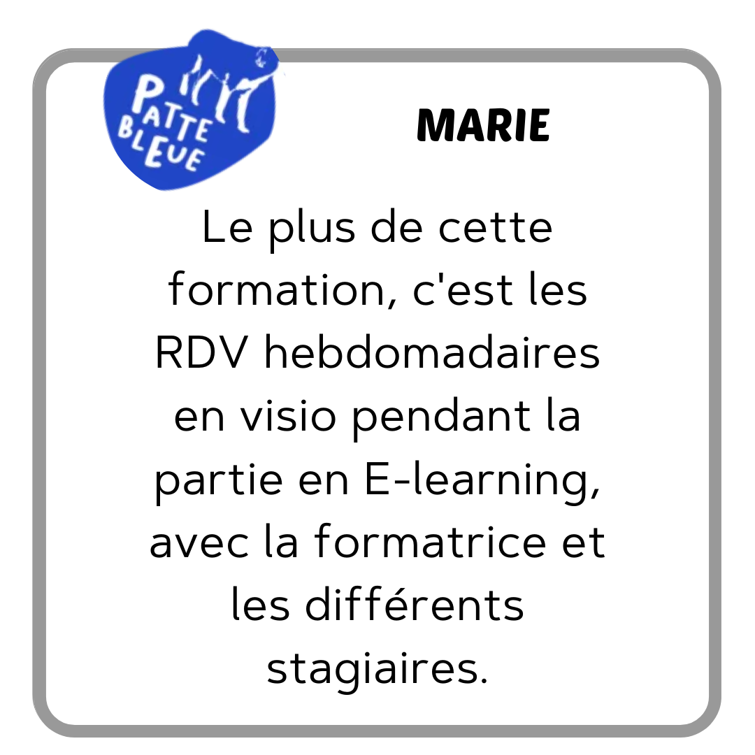 Et le gros plus (oui oui, encore un plus), elle assure le suivi des élèves après la formation. En cas de besoin, elle nous assiste dans la construction de notre projet et même par la suite, si on a des difficultés sur des consultations..."