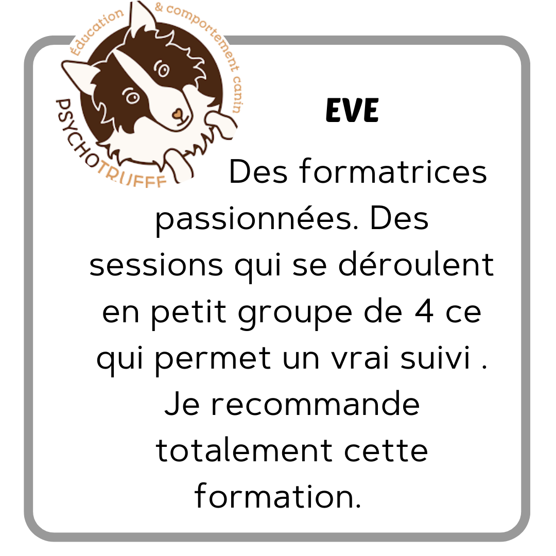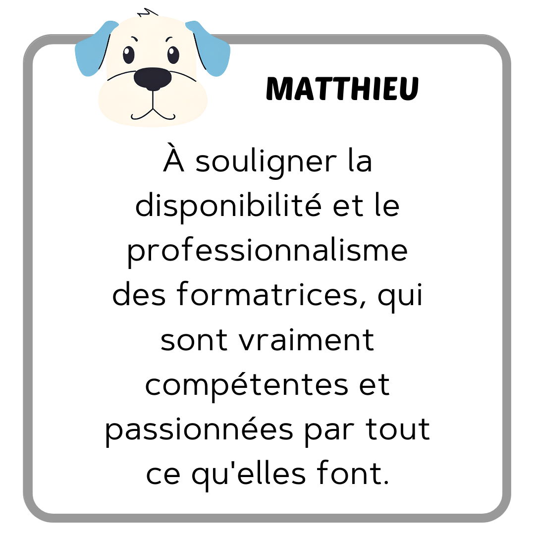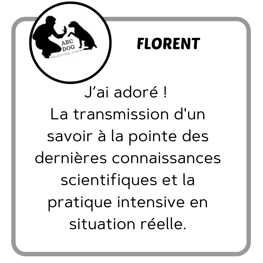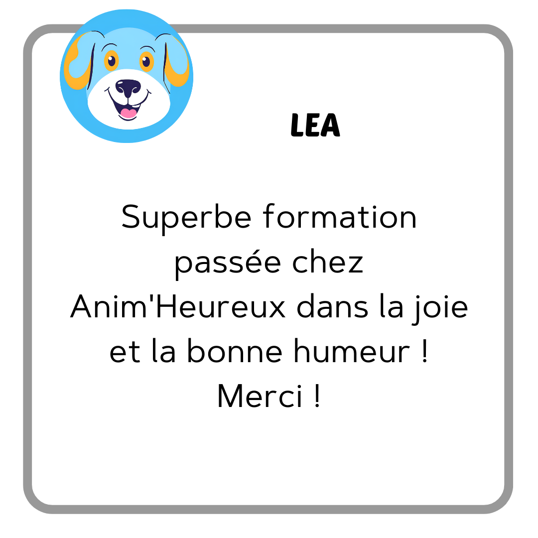 Antoine B. : "Comme beaucoup d’aspirants éducateurs canins, j’ai passé un nombre d’heures monumental à la recherche de la bonne formation. En effet, on peut trouver des formations 100% à distance, des longues formations (et pas forcément utiles), des pratiques plus que douteuses (avec des colliers électriques), des formations pratiques à 25 stagiaires (donc impossibles d’avoir un vrai suivi), des formations hors de prix…Et au milieu de tout ça, on trouve Anim’heureux ! ...